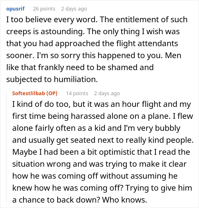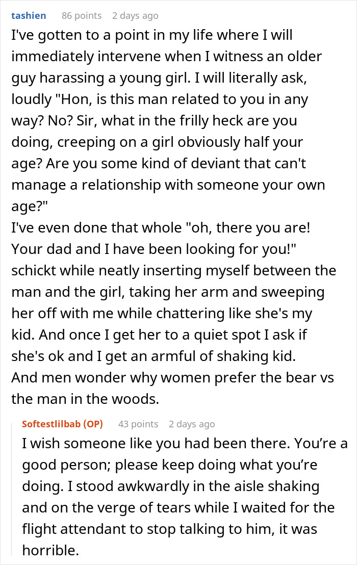 When Reddit user Softestlilbab was sixteen years old and flying to meet her dad, she ended up sitting in a row with a stranger who got increasingly interested in her as the trip went on. Learning that the girl was a minor didn’t stop him either.