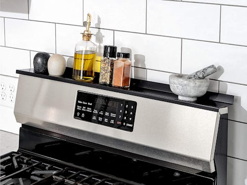 Add a little storage to your cooking space and keep must-have ingredients within arm's reach with this magnetic stove shelf. It attaches to the top of your stove with zero installation time. The large magnet stays put and creates a usable, flat shelf space to store spices or decor. It comes in three colors and three sizes and fits both flat and curved stovetops.