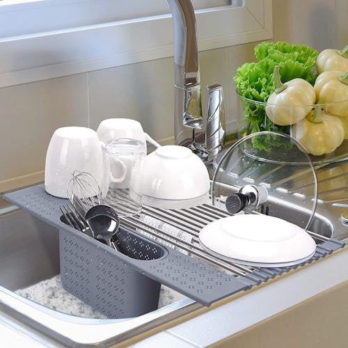 This roll-up dish drying rack has a built-in utensil caddy so you can dry all of your dishes at once while staying under budget. It fits across your sink, making clean-up after dinner simple, plus it doesn't take up any counter space the way most traditional racks do. It is designed to promote extra airflow, drying utensils and dishes fast. Once they're dry, roll up the mat into a narrow cylinder so it's easy to store. The non-slip rack is durable and resistant to rust and heat. It fits most standard sinks, but you may want to measure to be sure.