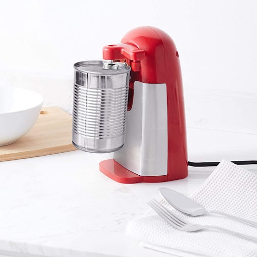 An automatic can opener is one of the most useful appliances to keep on your kitchen counter. This option has more than 7,800 reviews and a 4.3-star rating. It safely opens standard-sized cans using a stainless steel blade. The opener has a wide, non-slip base that holds it in place and a magnetic lid holder that secures the can’s lid after it’s been opened. It will automatically stop once the can has spun 360-degrees, so all you have to do is set it up, push the button, and get back to your recipe.