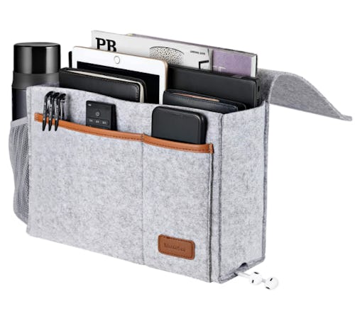 Keep all your bedtime favorites nearby in this convenient bedside caddy. It holds a ton of stuff like your TV remote, phone, favorite book, tablet, or water bottle, and it's just $17. It has two large pockets, one drinking bottle pocket, two exterior pockets, and a hole for your USB charging cables or headphones. The caddy is made of soft, yet durable felt that holds it shape and can support up to 20 pounds at a time. It's ideal for keeping on the side of your bed, your couch, even in the baby's room. Slide it between the couch cushions or under your mattress, or use the velcro to secure it anywhere. It's available in black, gray, and blue.