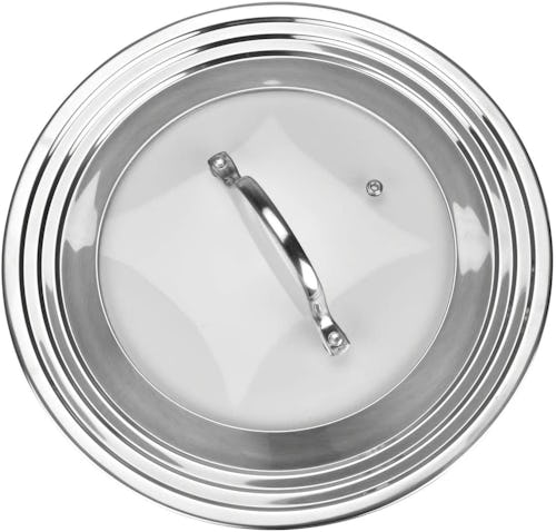 Reduce clutter in the kitchen with this universal lid for pots and pans. The tempered glass lid has a steam vent and stainless steel ring and fits on cookware between 7 and 12 inches wide. Plus, it's oven-safe up to 425 degrees Fahrenheit and dishwasher safe.