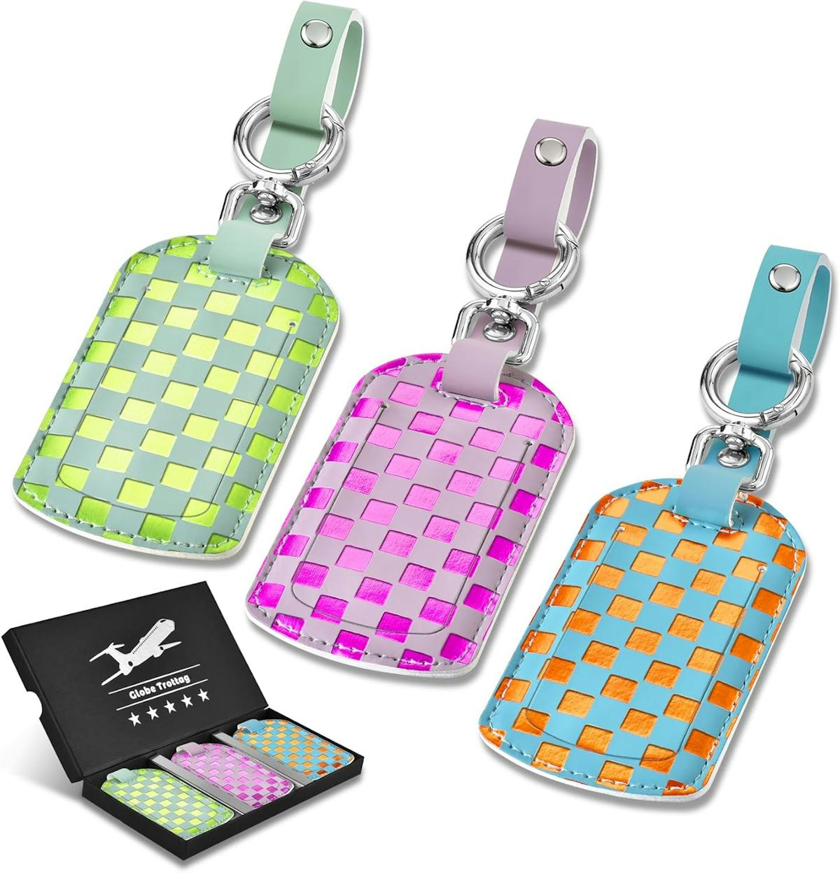 Checkered luggage tags that help suitcases stand out at baggage claim