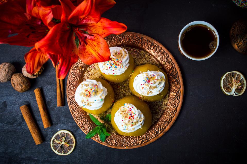 Made of whole poached apples stuffed with caramelized walnuts and whipped cream, this epicurean delight is a key component of any Eid spread in Bosnia and the rest of the Balkans region. Some consider this dessert to have its origins in Persia. Although, it was introduced to the locals in the Balkans by Ottoman invaders during the conquest of the region.