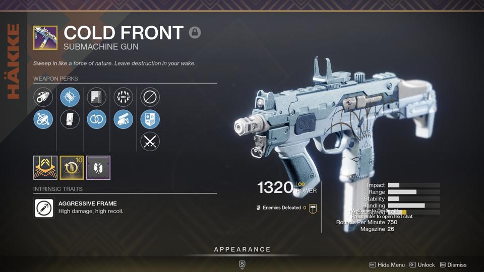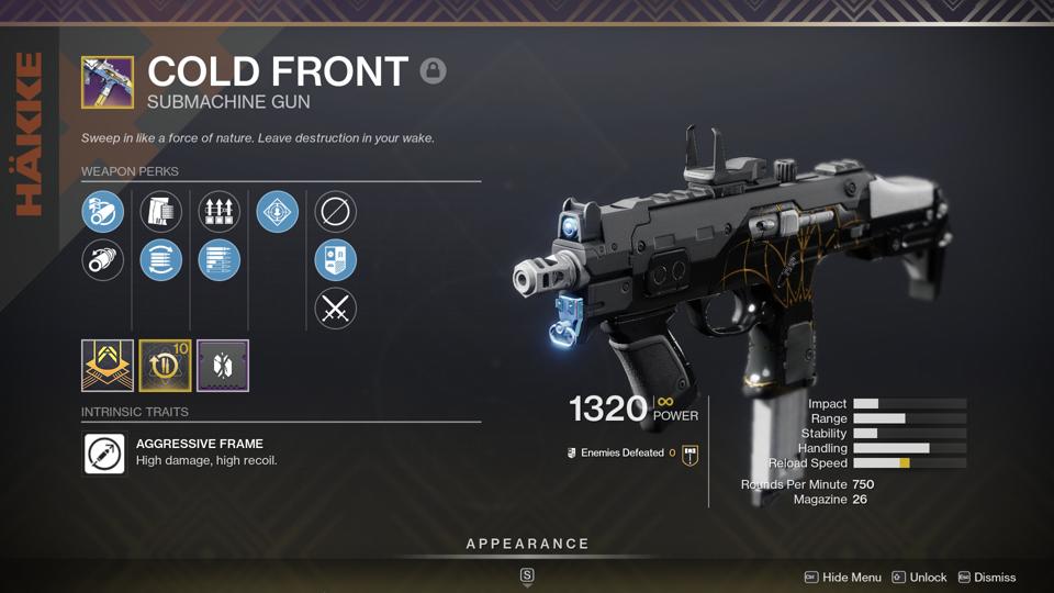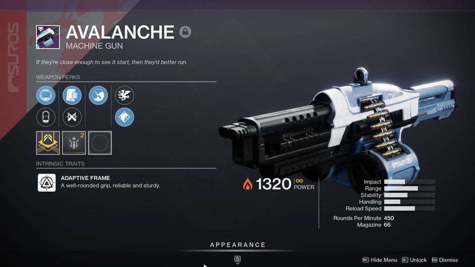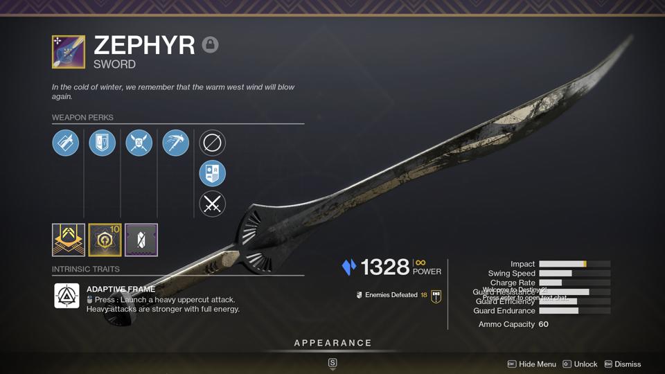 Duelist’s Trance or Relentless or Tireless/Cold Steel – Really the only thing that is going to set this sword apart from others is the new Cold Steel perk which slows and eventually freezes enemies. Given how that works, I’d say Duelist’s is your best bet as an upgrade over the masterworked one you get from Eva. There are other good rolls but I’d be amazed if you didn’t have other Whirlwind/Harmony swords already. Cold Steel is what makes this unique.