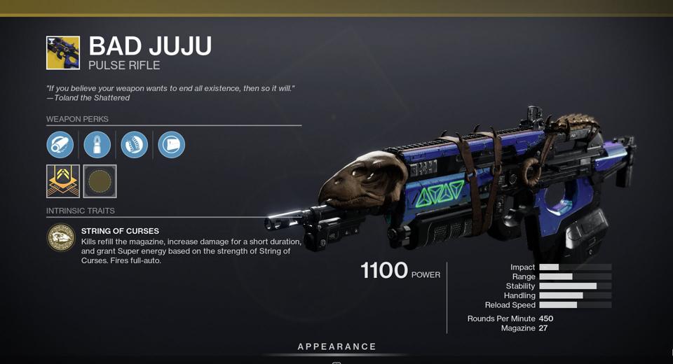 Bad Juju – Between a general PvE pulse rifle buff of 10% to red bars, plus this 40% buff, all exotic pulses are worth a look now, including Bad Juju with its stacking damage and super generation. I cannot wait to finally bust this thing out again.