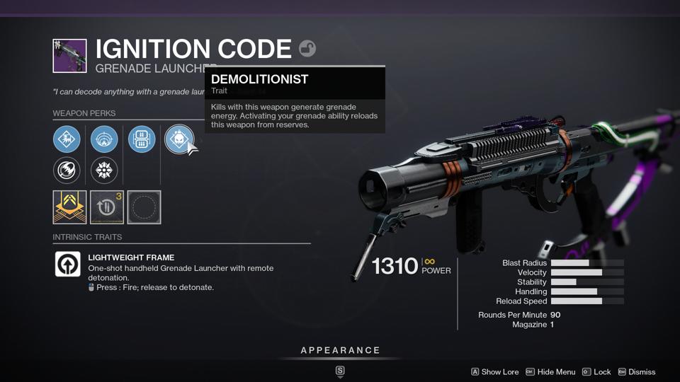 Slideshot/Demolitionist, Frenzy or Vorpal – Honestly, this is the only perk in the first row I would go for. This is the first breach grenade launcher to get slideshot, meaning you can insta-refill it on any slide, and then just combine that with your favorite perk on the other end and you’re good to go.