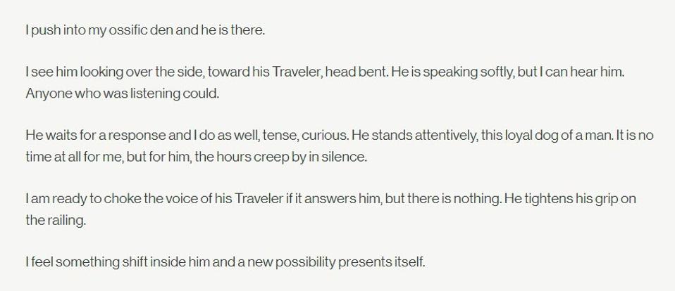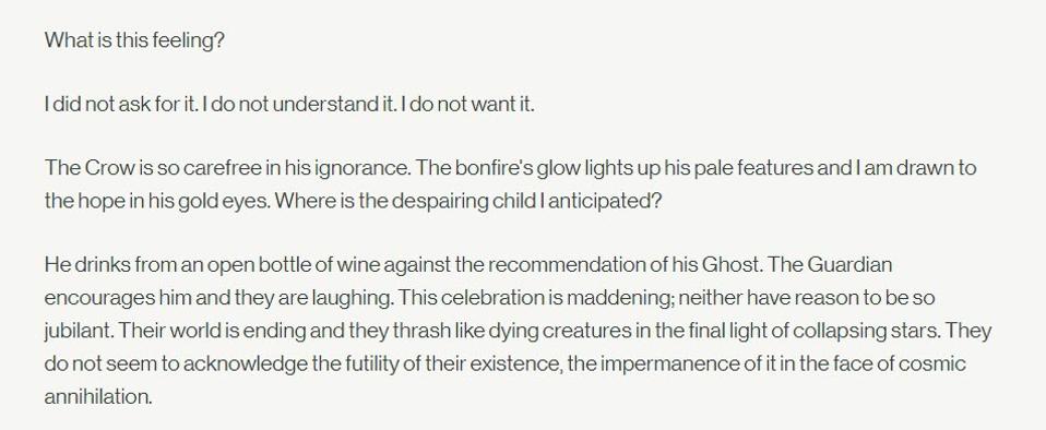 And there’s also the line here about “the despairing child I anticipated.” That implies Savathun was planning contact with Crow, and lends itself to the theory that he set up the situation where Osiris is rescued by Crow so the two can form a bond. And Savathun, in Osiris’s body, appears to be starting to feel things like happiness and camaraderie, against her wishes.
