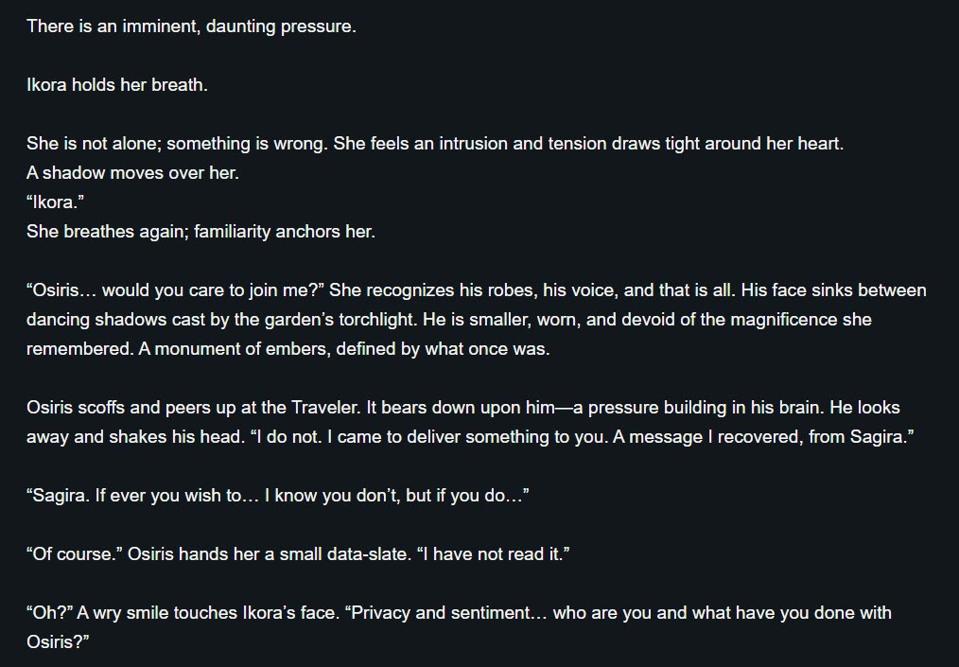 Fast forward to Season of the Chosen. There’s a lore entry called A Play of Shadow and Light that’s an interaction between Ikora and Osiris.
