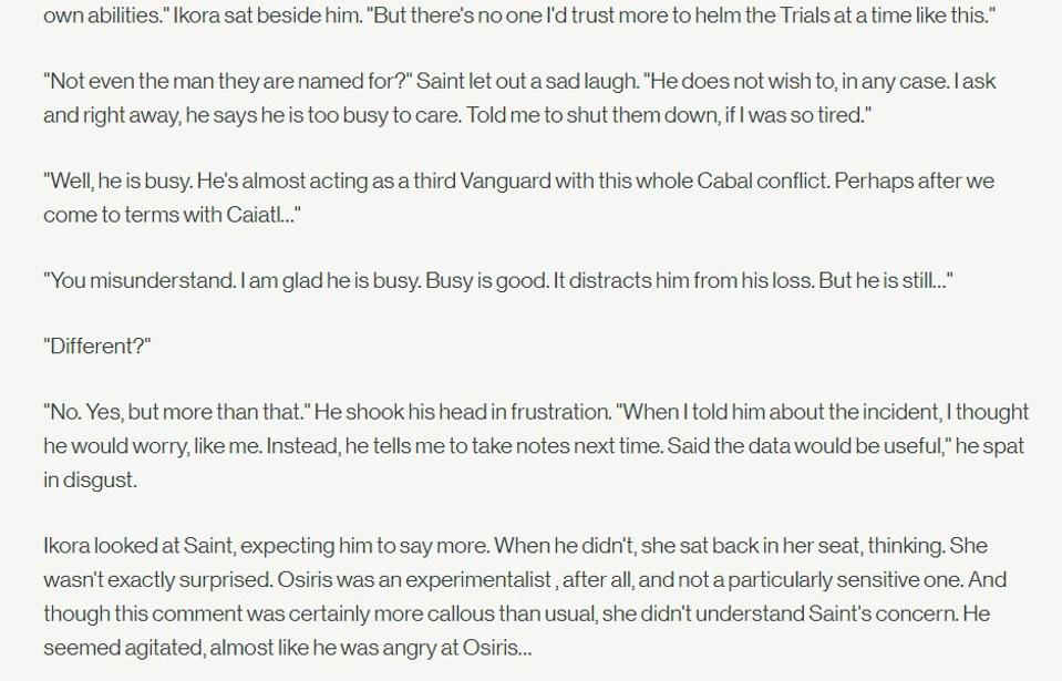 Saint confides in Ikora about how weird Osiris is being, and in the lore for In Memorium, the Trials Ghost lore, which shows the actual exchange, and at the end, Saint says he “wasn’t sure he knew Osiris at all.”