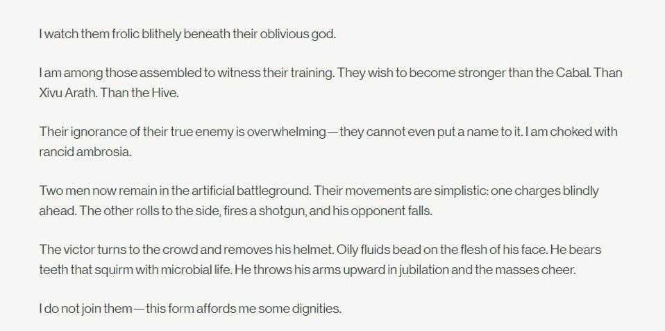 What I believe is the first time we got a lore entry from the perspective of Savathun was for the lore of Traveler’s Chosen in Season of Arrivals. In this entry, Savathun is spying on Zavala in the Tower, but not from the body of a human, rather, inside the skull that hangs over Shaxx’s head (that Eris has said he needs to get rid of).