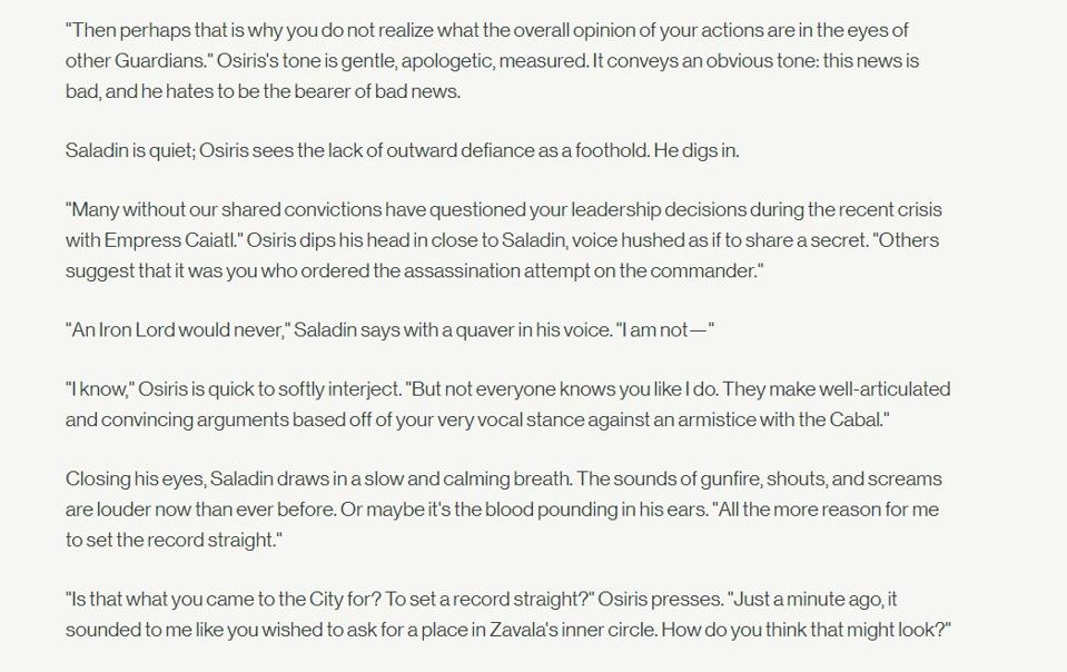 This leads into lore from Empty Vessel, the Vanguard playlist grenade launcher from Season of the Splicer. In this scene, Osiris heads off an attempt by Saladin to get into Zavala’s inner circle, saying that some people are accusing him of being the one to try to assassinate Zavala. Saladin is stunned, but Osiris reassures him by telling him to just give it time. This keeps a potential threat like Saladin out of Zavala’s orbit, and also lets Osiris deal with Lakshmi directly throughout the current conflict. It all seems extremely manipulative.