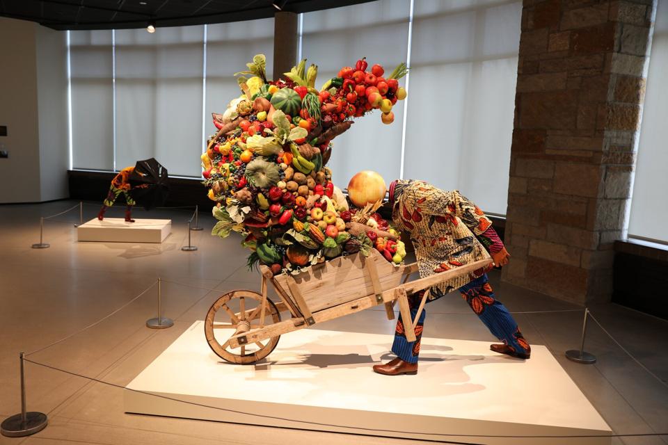 Shonibare states: “Food Man questions the sustainability of industrialized food production, distribution system, and waste in the world where the population is reaching 7.8 billion. … Sustainability is expressed through this gravity-defying sculpture in which Food Man is struggling to keep the balance of supply.”