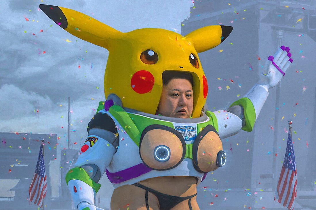 Winkelmann says among his personal favourite images that make up Everydays is a mocking “rebrand” of North Korean dictator Kim Jong-un decked out in Pikachu headgear and a piece of Buzz Lightyear’s suit, complete with breasts and long legs covered only by a dainty piece of underwear.