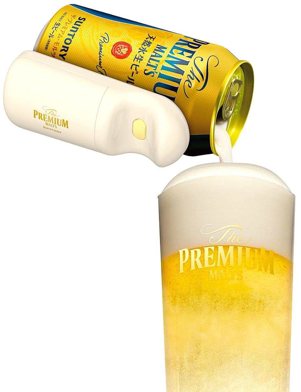 Suntory did not forget about consumers. The company offers a home version of the foam generating equipment called Kamiawa Server. By attaching the handy 4-inch gadget on the surface of a Premium Malt’s can, it generates 41,500 vibrations per second, which results in the perfect foam. It comes with a glass that can preserve the foam 20% longer than regular glass and sold for 980 yen (about $7) on Suntory and Amazon Japan websites.