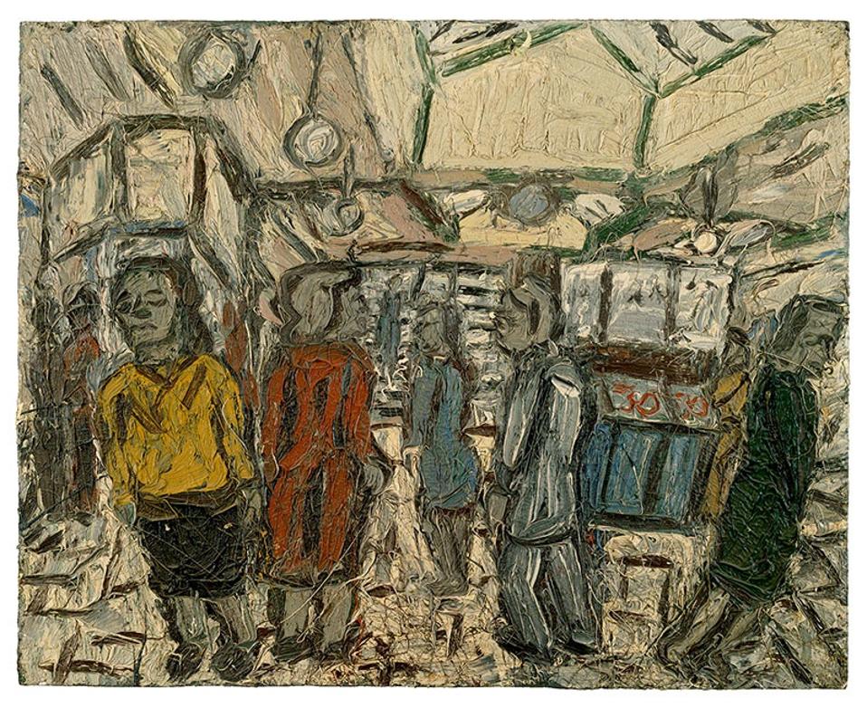 My favorite painting in the exhibition Booking Hall, Kilburn Underground Station no. 4 from 1978, is a masterpiece of Kossoff’s art, capturing the bustle of a subway station and rendering the half dozen or so figures in a way that is crude, primitive and almost cartoon-like yet captures reality as well as any Impressionist painting. The same is true in A street in Willesden No. 1 from 1983.
