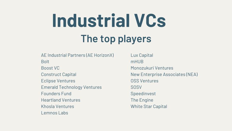 The development of ‘capital light’ manufacturing utilizing robotics and digital design, which is altering thinking. Several new firms have entered the space. Industrial multinationals have redoubled their efforts to track startups and now, many have their corporate venture arms. Still, the main industrial VCs and hardware VCs make up a shortlist: AE Industrial Partners, Bolt, Boost VC, Construct Capital, Eclipse Ventures, Emerald Technology Ventures, Founders Fund, Heartland Ventures, Khosla Ventures, Lemnos Labs, Lux Capital, mHUB, Monozukuri Ventures, New Enterprise Associates (NEA), OSS Ventures, SOSV, Speedinvest, and The Engine.