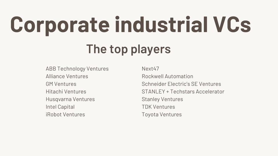 Nearly every major company has a corporate investment arm;the list is too long to mention. However, notable corporate investors in industrial tech like myself (with Natan Linder) define and care about, for Augmented Lean purposes: Stanley Ventures, Hitachi Ventures, and the automotives (Toyota Ventures, GM Ventures, etc.). ABB Technology Ventures, Husqvarna Ventures, Intel Capital, iRobot Ventures, Next47, Schneider Electric’s SE Ventures, STANLEY + Techstars Accelerator, and TDK Ventures to name a few more. In aerospace, AE HorizonX is a joint venture between AE Industrial Partners and Boeing. A few interesting multi-corporate VCs are also in the industrial space, notably Alliance Ventures (Renault-Nissan-Mitsubishi,) a $1 billion fund launched in 2018, although Nissan was widely reported as wanting to jump ship already by 2020 (see Reuters story). They did not in the end, perhaps because of bad press around it, and the emergence of connected and electric mobility. Instead, they have now issued a common roadmap, Alliance 2030: Best of 3 worlds for a new future. The former GE Ventures portfolio, of which 40 North Ventures acquired 11 investments, is also significant. Finally, Rockwell Automation actively invests in startups out of its corporate balance sheet (and is also an active acquirer of industrial automation startups.)