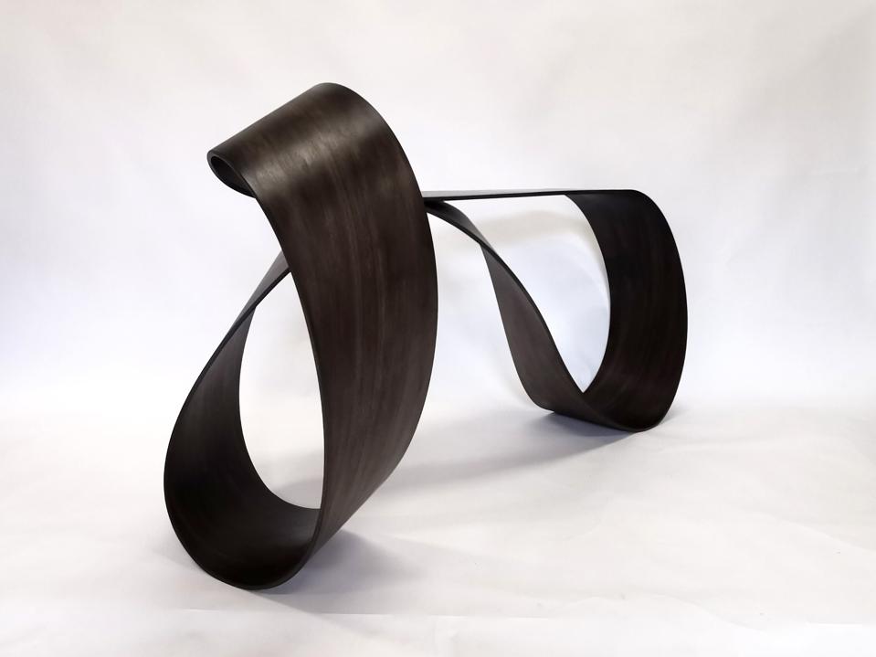 Anchored to the ground with a strong presence, Maison Dada’s Sumo armchair is sublimated by a wrap-around backrest, while Maison Parisienne’s Möbius console is an endless loop melding interior and exterior by Pierre Renart, who combines traditional woodworking with new technologies.