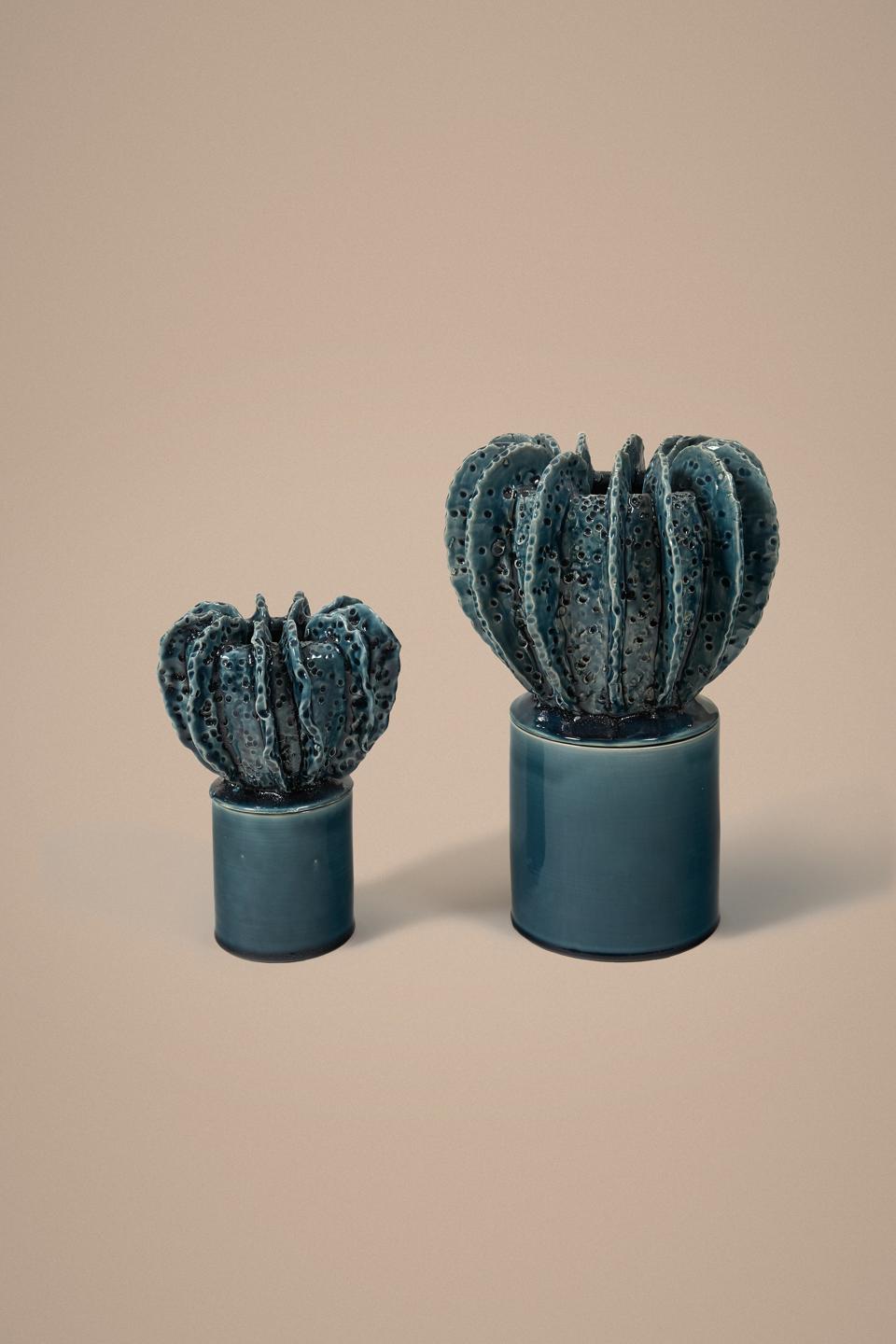 Handcrafted in Paris by Jean Roger, Laura Gonzalez’s Acropora glazed earthenware candleholders resemble a living form between a cactus and a coral.