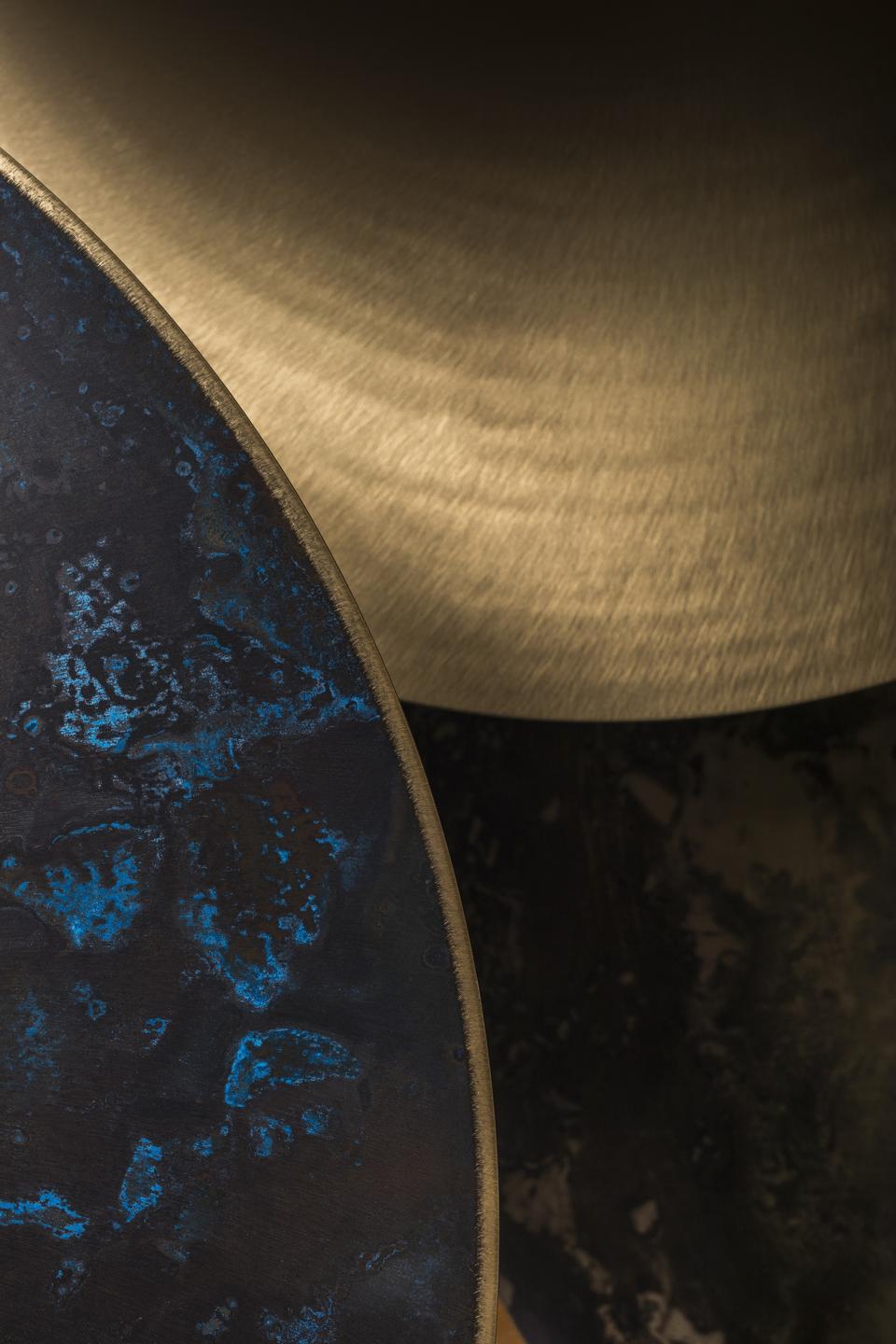Drawing from its jewelry-making heritage, Kopar embraces the uniqueness and allure of aged brass and copper to create one-of-a-kind round tables, while Bibelo’s minimalist and graphic Surface wall shelf and console table are constructed from two flat, stone-shaped surfaces.