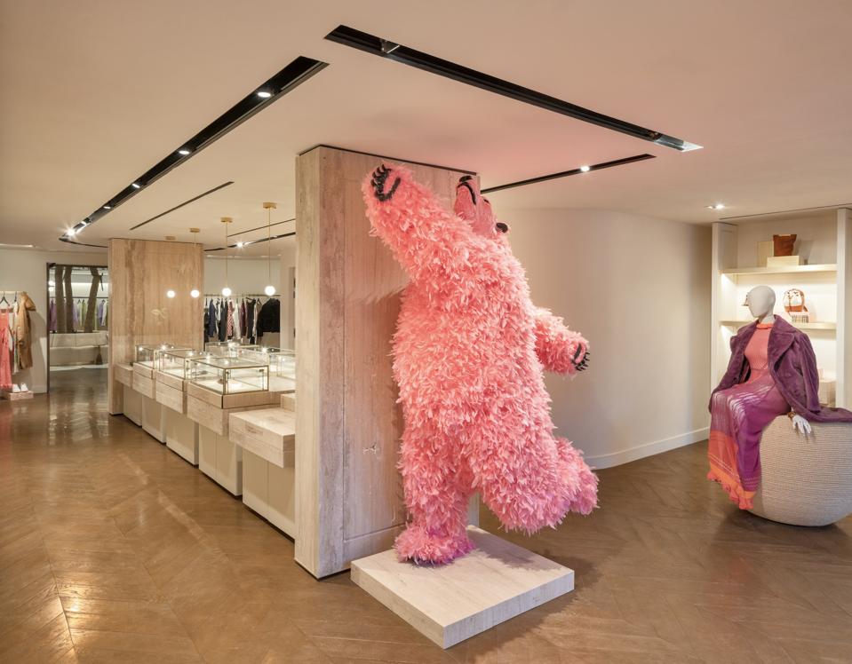 The 6,500 square foot store boasts a historical storefront constructed in 1884 by Leeds Sheppard has been doused in the retailer's signature pink—referencing their Michael Roberts-designed pink flamingo mascot—and was designed by Parisian interior designer Stéphane Parmentier, who is also the creative director of The Webster Home vertical. A giant bear covered in pink feathers sits at the entry in a nod to its Canadian host.