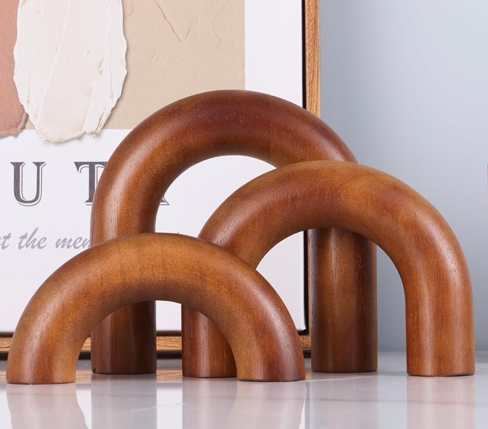 While having open storage is popular, it’s also easy to overfill with knickknacks and clutter. Mad Mod Home’s Robin DeCapua has a solution: “I'd choose one color for all your on-display decor — white is ever-popular and brown is trending — and have only this one monochrome decor visible.” These brown wooden arches are a gorgeous and sleek way to add some sculptural interest to your shelves without making it feel overwhelming, thanks to their color coordination. The best part is that they’re versatile — you can display them individually or intertwine them for one gorgeous, museum-worthy sculpture.