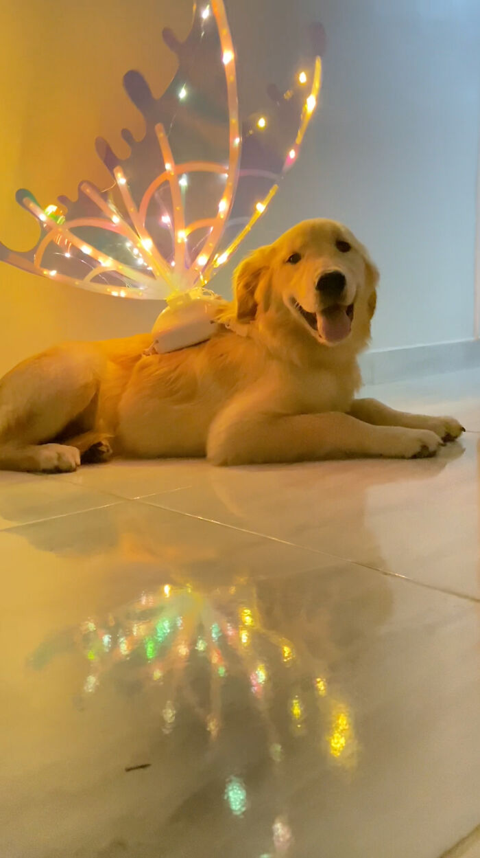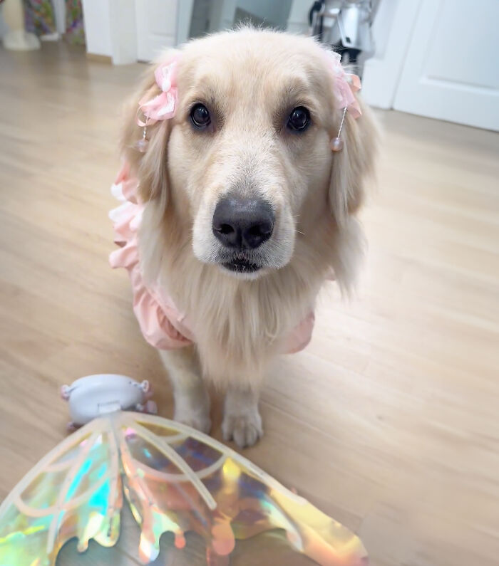 Golden retriever asks for her fairy wings each time she goes out