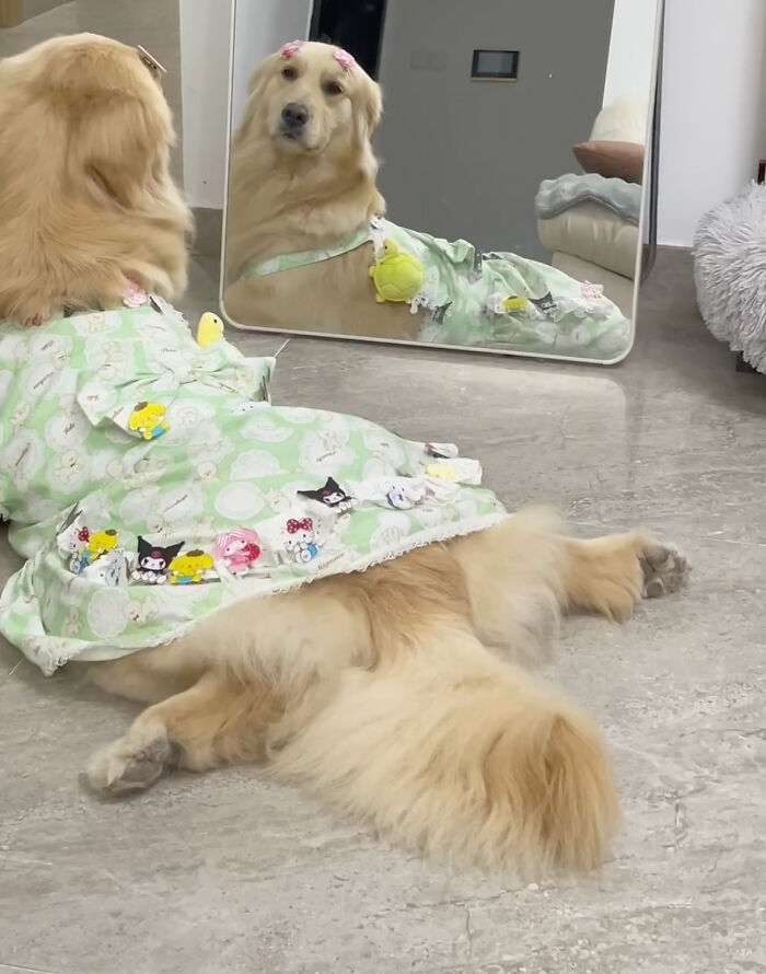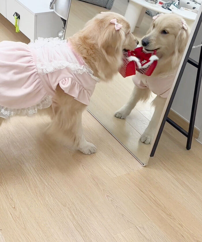 There are also several videos on social media of a golden retriever named ‘Sakura-chan’ from Jiangxi province, China, where we can see the dog enthusiastically running back and forth from the mirror while dressing up in adorable different style dresses and carrying matching handbags.
