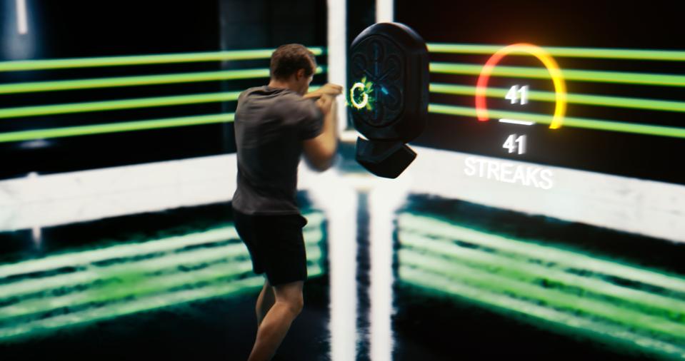 Having tried the physical version, I can tell you it’s really similar to the virtual version. But the latter is way better and more immersive. Once you log in, a trainer comes into view – life size – and explains what you can do in the app and how to stand and throw punches. From there, you see a menu of your options. You can take classes with the brand’s network of trainers, learning technique and punching the lighted targets in time to music. You can do sparring classes and mitt drills. And you can do QuickPlay/Punch Tracks, which lets you choose from a menu of songs and punch the lighted targets. Whichever training session you choose, the app keeps track of your punching efficiency score – essentially how many targets you hit out of how many you could have hit – and your punching velocity. It’s fascinating.