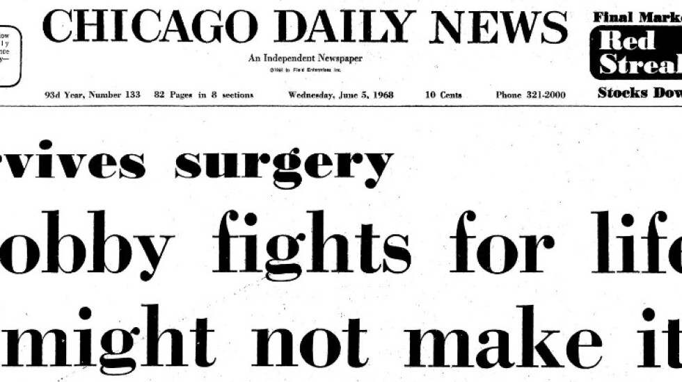 Just after midnight on that day, the senator and presidential candidate was shot while he was leaving through a hotel kitchen in Los Angeles. Kennedy had just won the state’s Democratic primary and seemed to have a clear shot at the nomination and the White House. The assassination happened at about 2 a.m. CT, so the Chicago Sun-Times had no coverage of the shooting that morning. It would’ve been up to the Daily News to provide some of the most updated coverage at that time.