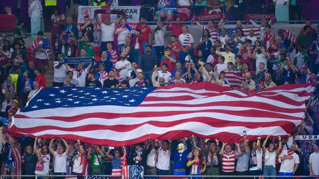 Oh, about that 30-foot flag. Teddy and his wife arrive for U.S.-Wales early. They march with the U.S. fans. But their friends have some of their tickets, and those friends are late to arrive. They’re late, because the ticketing system is down, which is indicative of the stadium experience here, where the concessions are often sold out of everything but Budweiser Zero and the Wi-Fi is like a choose-your-own-adventure book.