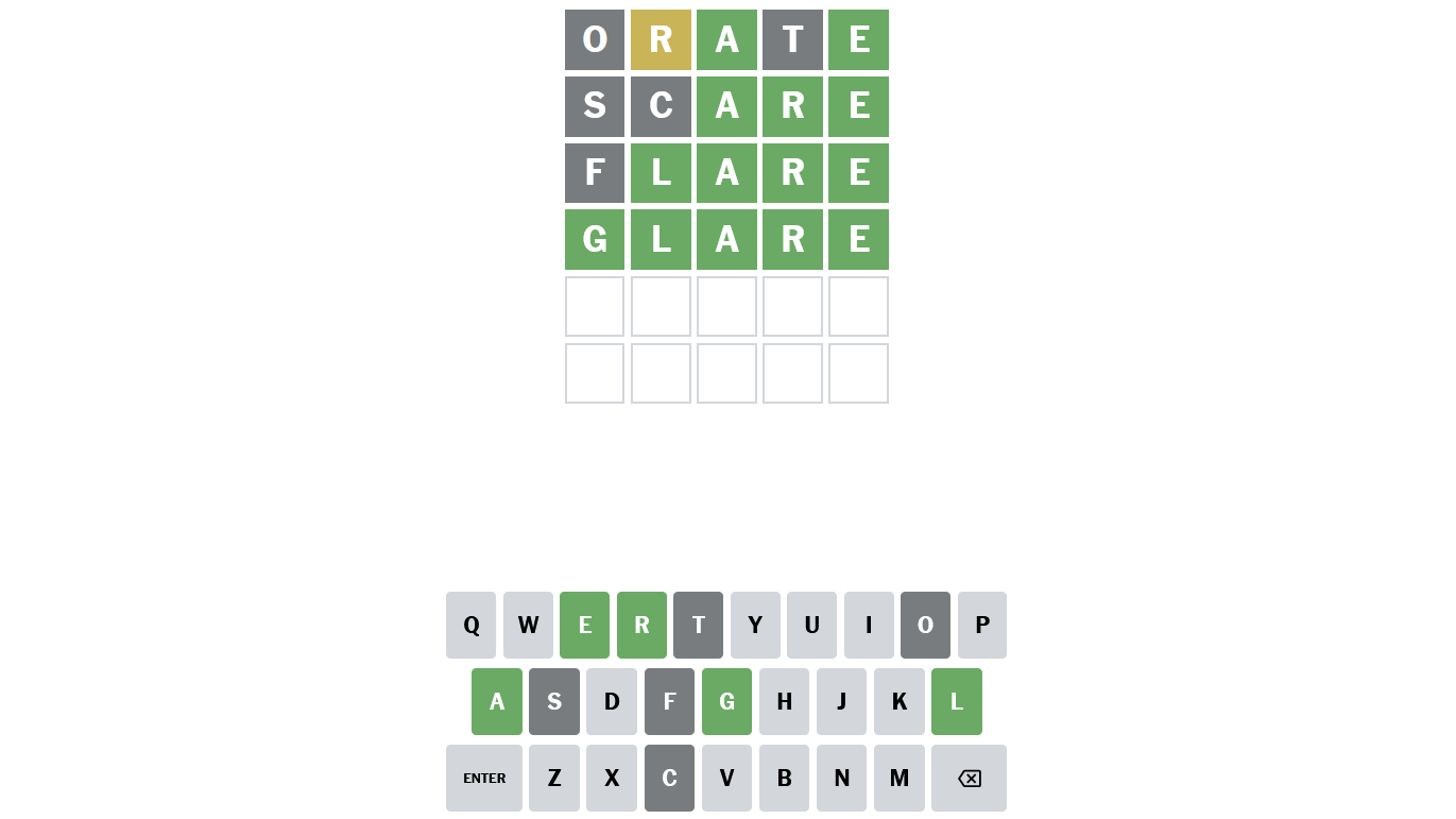 I tried FLARE next, and pleasingly the 'L' went green, leaving two options: GLARE and BLARE.