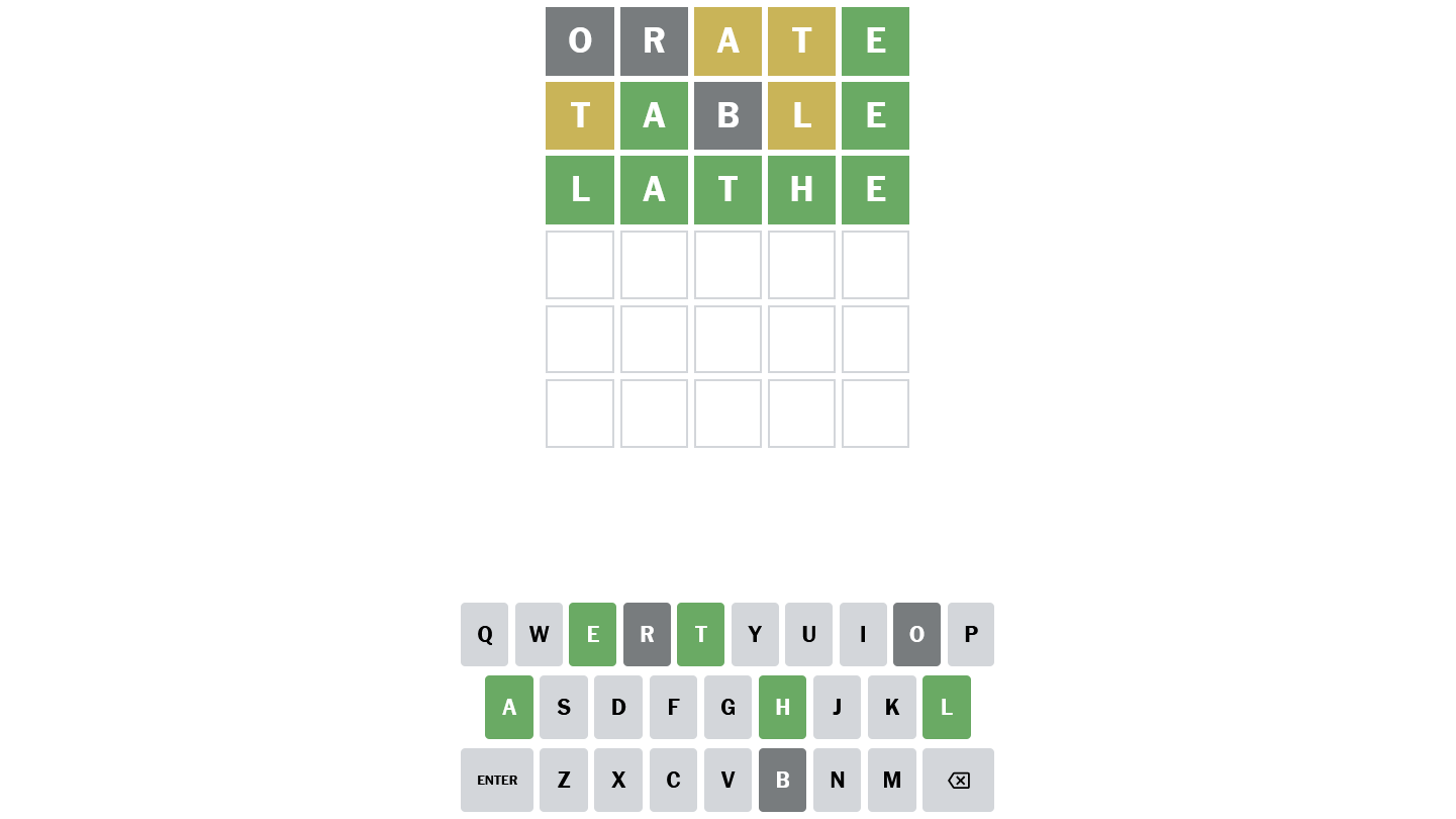 * These were: TABLE, BATHE, TAUPE, LATHE and LATKE.