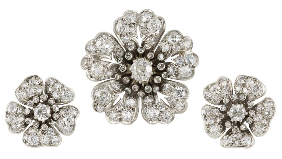 Bentley & Skinner’s Victorian diamond flower demi-parure, consisting of a brooch and a pair of earrings, each in the form of a flower-head, centrally claw-set with an old-cut diamond surrounded by individually raised diamond-set stamen and five diamond-encrusted petals, A Victorian floral brooch and matching earrings.