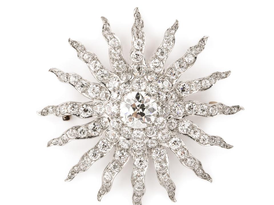 A La Vieille Russie diamond sunburst brooch set in gold and platinum centering an old European-cut diamond surrounded by smaller old European and old mine-cut diamonds. Howard & Co., New York, ca. 1905. With original case and en-Tremblant hair fitting.