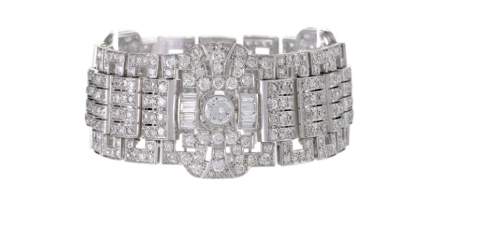 Macklowe Gallery’s 1930s finely-articulated French Art Deco bracelet features approximately twenty-eight carats of diamonds set in platinum. Composed of three openwork plaques alternating with groups of open rectangular links joined by bars, the bracelet is pavé and channel-set throughout with old European and baguette-cut diamonds.