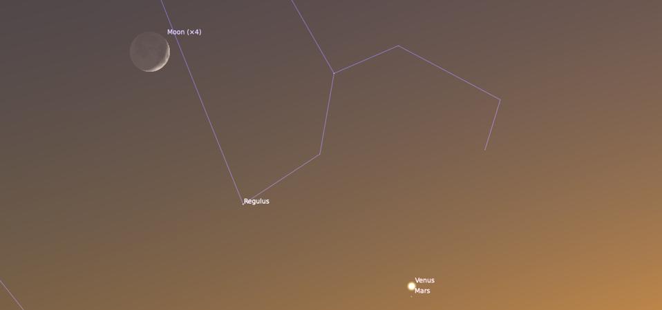 Look to the west-northwest sky just after sunset tonight and you’ll get another chance to see Mars and Venus about 0.5º from each other, only this time Mars will be just below Venus. A 16%-lit crescent Moon will linger high in the southwest.