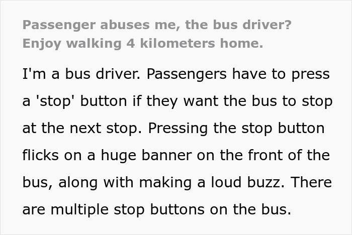 Unfortunately, some folks don’t understand the meaning of basic manners. Redditor u/Unthanked_Bus_Driver shared how they dealt with a verbally abusive passenger to teach them a lesson they’ll never forget. Scroll down for the full story. Bored Panda has reached out to the author of the story for comment via Reddit, and we’ll update the article as soon as we hear back from them.