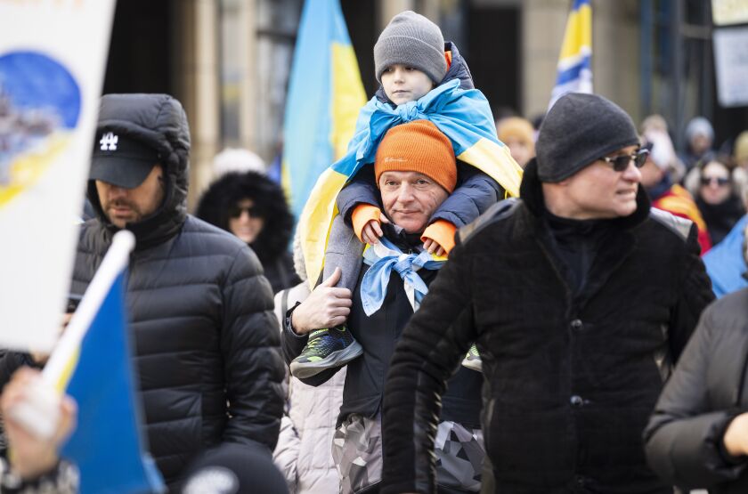 “These people are trying in every way possible to preserve their families, their homes and their love of Ukraine,” said Sen. Dick Durbin, D-Ill. “Can we do anything less than to stand out here on a chilly day, in the sunshine, in a peaceful setting and pledge our solidarity to the same cause? No. We need to stand together.”