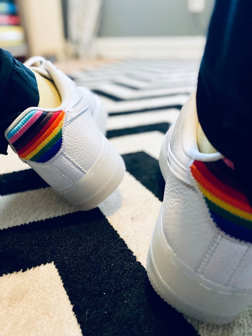 For many of us living in New York, life still hasn't gone back to normal after the COVID-19 outbreak. This means that — among many other, more important things — I still can't be outside wearing my freshest sneakers all the time. But I'm not going to let that stop me from having new pairs show up at my door. The latest one is the Air Force 1 BeTrue, which is part of Nike's 2020 footwear and apparel collection celebrating the LGBTQIA+ community. This year's Pride-themed sneakers include the brand's iconic AF1 for the first time ever, and they come with design cues inspired by the "More Color, More Pride" flag that was introduced in 2017, in addition to the standard Pride hues.