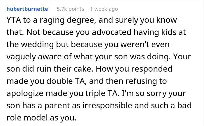 They found it absurd that despite pushing the bride to invite kids and then let her own son ruin things, OP didn’t even have a bit of remorse that she was in the wrong. Psychology Today states that some people refuse to admit they are wrong, even in the face of overwhelming evidence, due to a fragile ego.