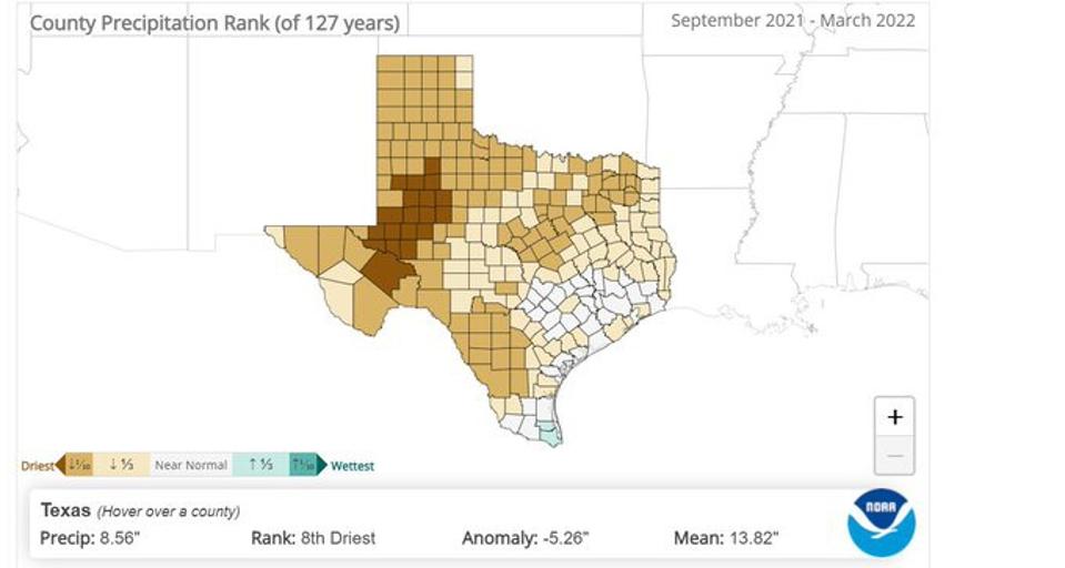 In a report issued by the NOAA’s National Center for Environmental Information (NCEI) in mid-April, the agency noted that, “The current multi-year drought across the West is the most extensive and intense drought in the 22-year history of the U.S. Drought Monitor.” For the first three months of the year (2022), precipitation deficits were nearing or at record levels. Victor Murphy is a Climate Services Manager for the National Weather Service. On April 16th, he tweeted the image below and said, “19 west TX counties from Pecos in the south to Crosby in the north have seen their driest September-March time period on record, dating back to 1895.” By the way, The Dust Bowl was after 1895.