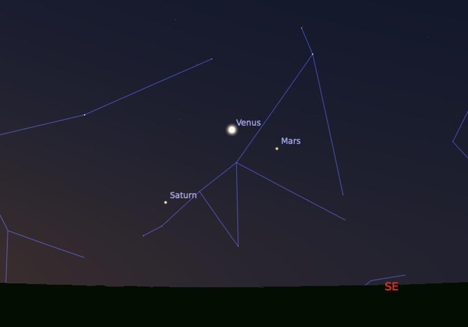 Just use your own naked eyes and you'll see an unmistakably bright, white object shining above the horizon. Look carefully and you’ll also see the very much dimmer planets Mars to its right and Saturn just below-left.