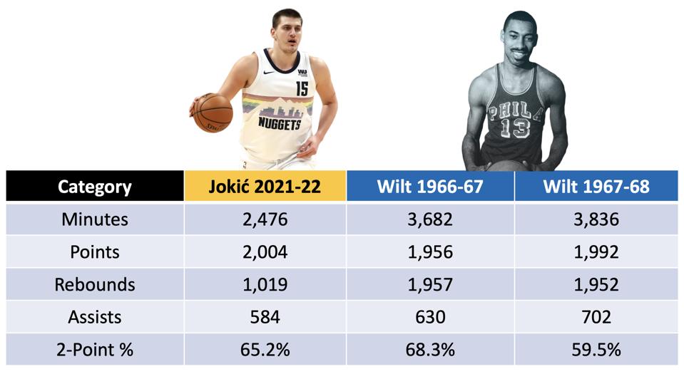 While nobody is on par with Chamberlain as an hellacious rebounder, the versatile attack of Jokić put him in the same company as a statistical giant. It should be mentioned the years shown below are Wilt’s seventh and eighth NBA seasons, which typically aren’t the ones you point to when highlighting how much of an anomaly he was. But, adding to the comparison, this is also Jokić’s seventh regular season.