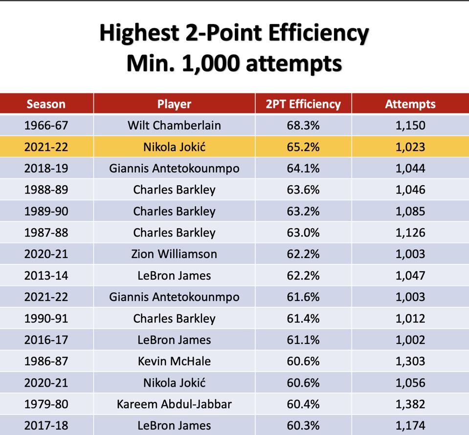 You don’t have to look into statistics with acronym titles, or the metrics that scare people away because they don’t care to learn about what each of the numbers value. In simplest terms, among all seasons with at least 1,000 shot attempts, Jokić just posted the second-highest efficiency within two-point range. Not just in this era – across the NBA’s 75-year history.