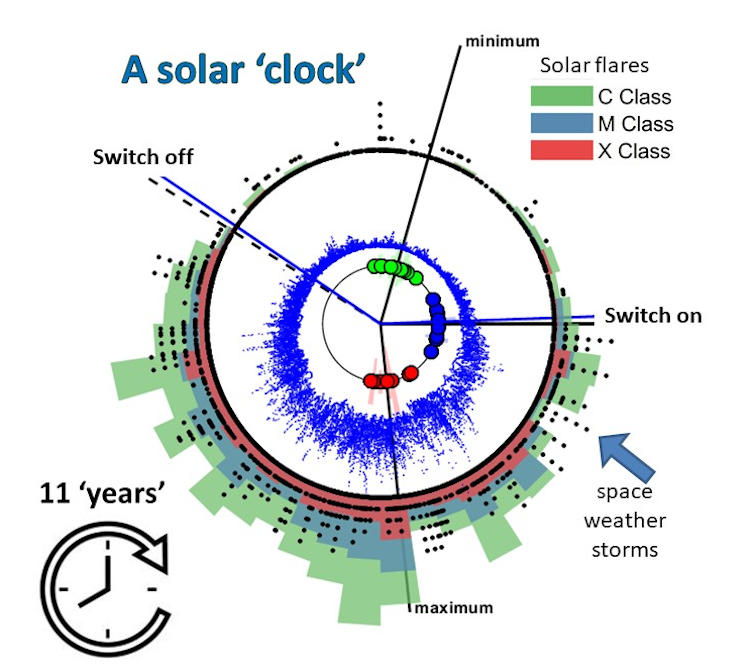 We can read back from the sun clock to see where (or when) we are in the solar cycle, so as well as helping tourists to plan their Nordic holidays to see the northern lights, this graphic could also help power grid operators who need to schedule critical maintenance during periods of quiet space weather.