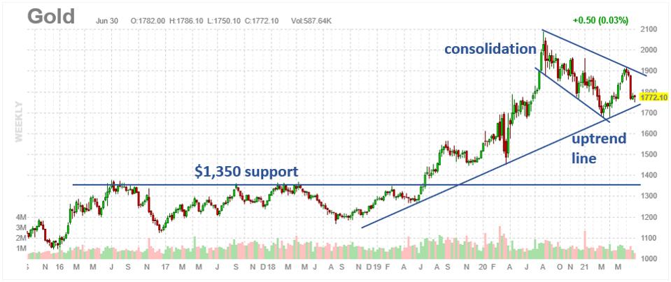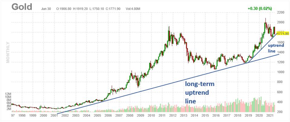 After a brief surge over $2,000 per ounce last summer, gold has been a lackluster performer in the past year - especially when compared to cryptocurrencies and technology stocks. The yellow metal is down approximately 15% since its peak in August 2020, when the coronavirus pandemic was still raging. Despite its disappointing performance in the past year, basic technical analysis shows that gold’s long-term trend is still up.