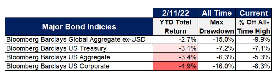 Looking at the first table in this article, you can see that core U.S. bond indices (treasuries and the aggregate) are close to their historical max drawdowns. The more volatile bond sectors (ex-U.S. and U.S. corporate) are still well below their max drawdowns.