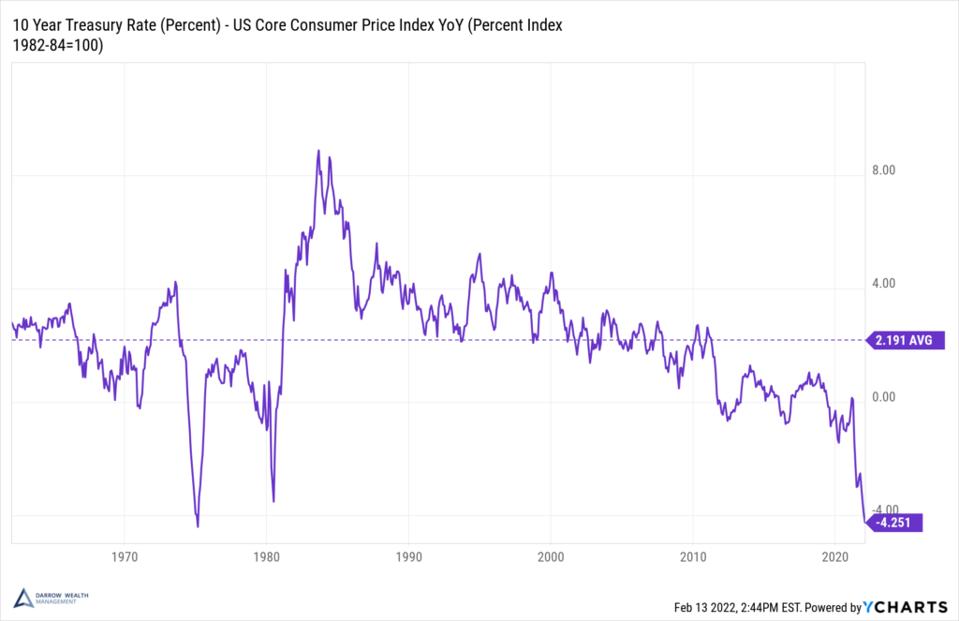 Inflation has been soaring due to fiscal stimulus which put a lot of cash in people's pockets and a beleaguered supply chain which has been unable to keep pace with demand. When inflation is high, and bond yields are low, the real yield (inflation-adjusted) can be negative. Right now, real yields are -4%! This may cause some investors to rethink their investment strategy as it relates to fixed income.